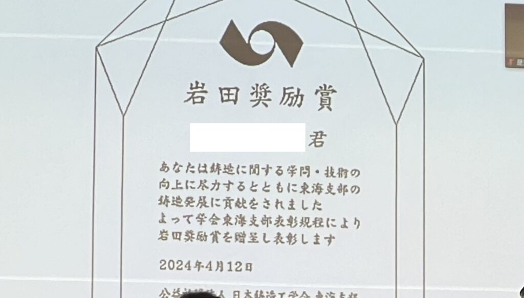 本日、2023年度の岩田奨励賞の授与が愛知県刈谷市のシャインズにて行われました。